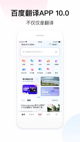 - 拍照翻译:无需输入,轻轻一拍,翻译结果立刻实景展现。百度翻译支持拍照、涂抹、AR三种模式,覆盖中、英、日、韩、法等20种热门语言。
