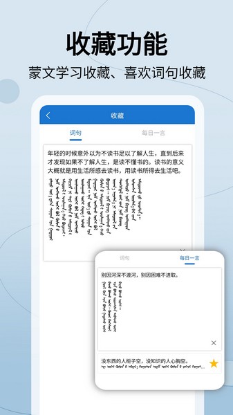 翻译后可以收藏蒙古文谚语句子、蒙文单词等,有助于学蒙语,随时查看。