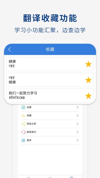 收藏功能:翻译后的彝文词句文章可以选择收藏,收藏后可在收藏功能查看,有助于学习彝语,边查边学