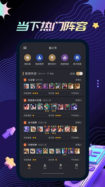2、在主界面当中,用户可以看到很多阵容的推荐,你可以点击任意阵容进行查看详情,在详情中可以看到阵容的阵容站位、核心英雄、准备分配、当前羁绊效果、强化符文推荐等等仔细的内容
