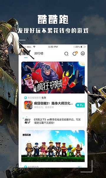 1、下载打开酷酷跑官方版,进入首界面,这里有许多首推的好玩,当然你也可以进行搜索你想玩的游戏;