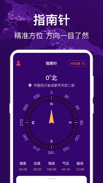 海拔测量仪App官方最新版是一款特别好用的指南针定位服务应用,在这里,不但能够提供超多指南针皮肤来让你可以根据自己的相关需求和喜好进行选择使用,并且支持高度测量,方便你在线查看地面是否水平,而且能够利用网络、GPS以及手机传感器等数据来精准确定你当前的经纬度、海拔乃至气压等详细信息,同时为你实时显示东南西北四个方向,帮助你出行导航与事实了解方向提供合理依据。