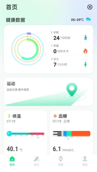 1、多样记录: 软件可以实时记录用户的多种运动数据和身体数据,包括步数、站立时长、热量消耗、血糖和体温等,非常方便实用。