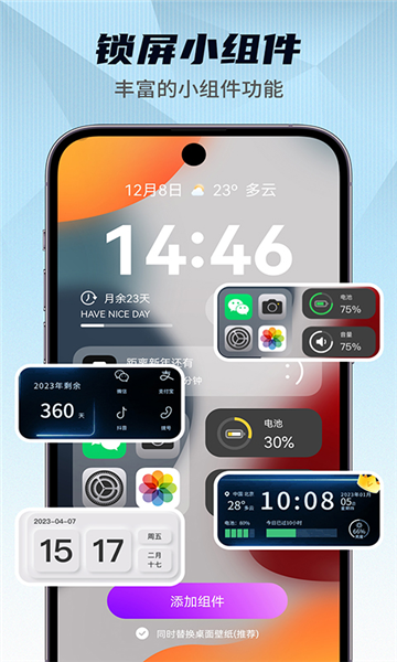 这个应用的亮点还包括操作通知,比如充电、播放音乐这些都能收到提醒。还有各种风格的主题可以选,像清新、可爱或者华丽,总能找到适合自己的。特别是猫咪电量这种小组件设计,既实用又有创意。