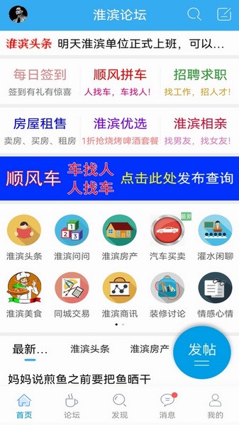 淮滨论坛是一款为淮滨县当地居民用户准备的本地生活服务软件。这款软件能够为用户展示淮滨县当地的社会风貌,将发生在淮滨的大小事件全部报道在这里,无论是否是淮滨人都可以通过这款软件来加深对淮滨的了解。用户可以点击进入软件上不同的功能版块内,根据自己的需求筛选信息,借助淮滨论坛提供的信息在淮滨更好地生活。