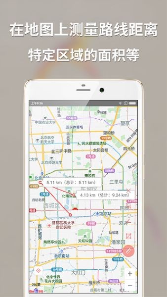 4、地图测量:利用GPS与地图数据,在地图上直接测量路线的距离,特定区域的面积等;