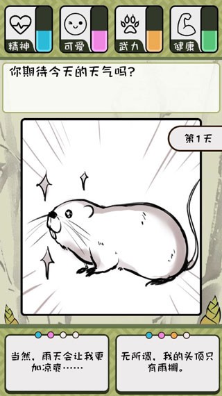 《竹鼠活下去最新版》是一款非常有趣的休闲益智手游,画面清新简约,玩法简单又充满挑战。玩家需要帮助可爱的竹鼠完成各种任务,解锁成就并体验不同结局。游戏中的每一个选择都会影响竹鼠的四个关键数值:武力、精神、健康和可爱值,这些数值的变化会直接影响剧情走向和最终结局。比如,如果武力值升满,竹鼠可能会触发“你好厉害”结局;而如果健康值降为0,则可能触发“中暑”结局。