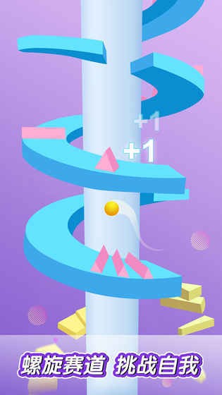 3、螺旋跳跃:点击屏幕使小球跳跃,点击的时间越长,跳动的高度越高,游戏中通过障碍物后会获得分数,而触碰障碍物后将会死亡!