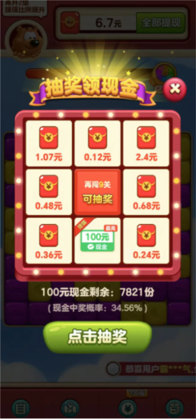 小熊削削乐是一款新上线的消除游戏,以领取红包为特色,为玩家提供消除方块赢取红包的乐趣。新手注册即送红包,随着消除闯关次数增多,红包奖励也随之增加。玩家消除越多,可积攒并提取更丰厚的红包奖励,让您轻松获取到账。