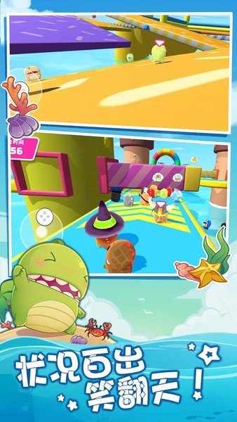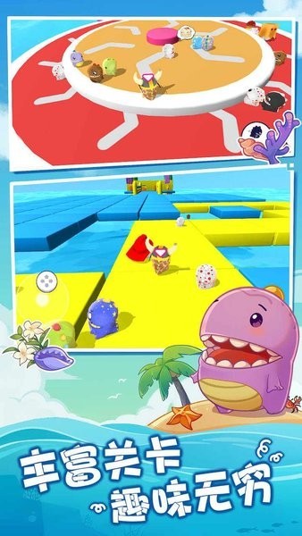 游戏设计了很多有趣的玩法,比如不同类型的陷阱机关、搞怪的道具系统,甚至还有角色撞飞时会弹出星星的可爱动画。体型胖嘟嘟的小恐龙在操作上也很简单,适合新手快速上手。