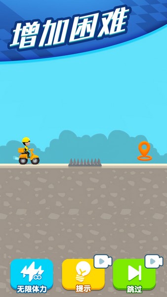 3、若遇难题,可点击提示按钮获取通关思路,或用无限体力持续尝试,绘制路径时避开陷阱,保障骑手配送成功。