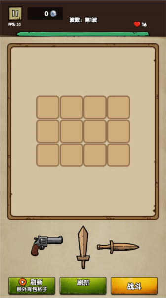 2、在战斗之前会随机给出三个武器,玩家需要将武器放置在格子上,这样才能让角色对战敌人;