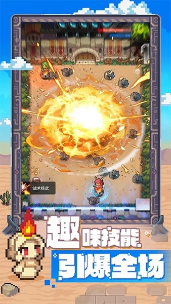 游戏的特色玩法包括多样的战场效果(如燃烧、雷击、冻结等),真实的物理弹射机制,以及丰富的卡牌搭配系统。每个英雄都有独特的技能和特性,比如“娜吉尼”能召唤大蛇形成防护墙,通过敌人碰撞来消耗对方血量。她的低攻击高血量属性让她更适合依靠多次碰撞叠加伤害。