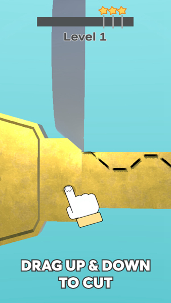 1、进入第一关根据界面提示,上下拖动手指,操控刀具切割金色物件,完成关卡初始操作。