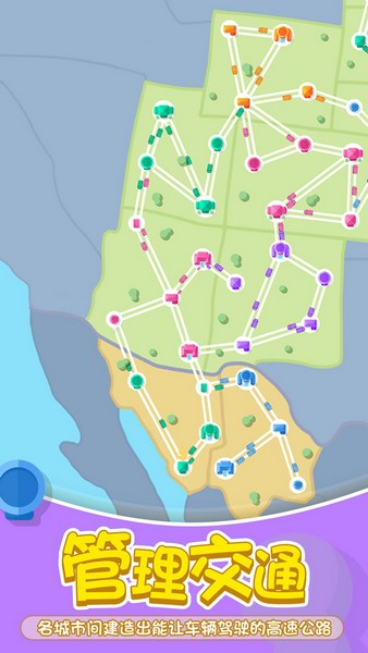 迷你交通是一款十分休闲的经营类游戏,有着非常舒适的卡通画风,玩家可以在这里管理各个地点的交通路线,将这些路线连接起来打造出高速通道,让这些城市可以相互连通,通过收取高速路费来获得收益,然后用这些钱去升级这些路线,或者是解锁更多的地图并开拓更多的高速公路。除了经营外,连线的方式也是十分讲究的。