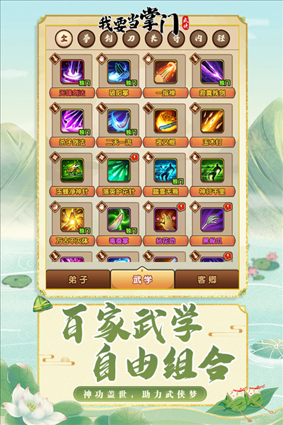 包含弟子、武学、客卿三个图鉴合集,我要当掌门游戏前期主要是完成任务的方式获得弟子、武学以及客卿,当完成招募条件时,可在图鉴处招该弟子或客卿。
