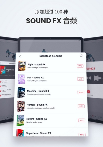 点击左侧的音乐图标,我们进入了音频编辑界面,这里我们可以加上音乐或配音,软件自带的音效需要付费。