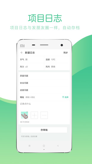4、项目日志:日志编写如同微信朋友圈一样便捷;支持项目成员日志的集中查看和存档,云盘同步永久保存。