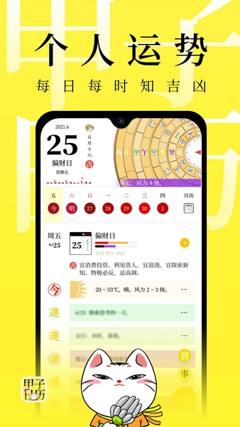 甲子日历极速版是一款主打日历查看的软件,其功能相当强大,通过这款软件,用户不仅可以快速查看月份天数,还融合了万年历功能,带你查看每日事宜禁忌、天气信息等内容!并支持在目标日期制定当天计划,到点即刻提醒,避免遗忘办理!不仅如此,用户还能通过软件快速进行测算运势等内容,非常趣味!