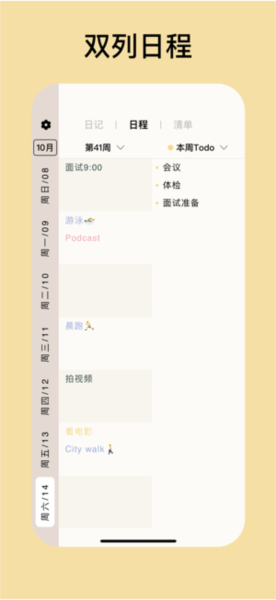3、日程管理(周计划):左侧为周计划,右侧为清单,用户可以自由填写事项,点击即可直接输入,也可从右侧清单拖入,操作简便。