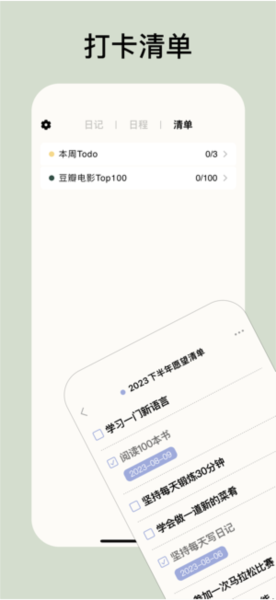 2、清单功能:打卡页自动记录进度和完成时间,灵感中心提供多样的打卡清单,帮助用户保持动力。