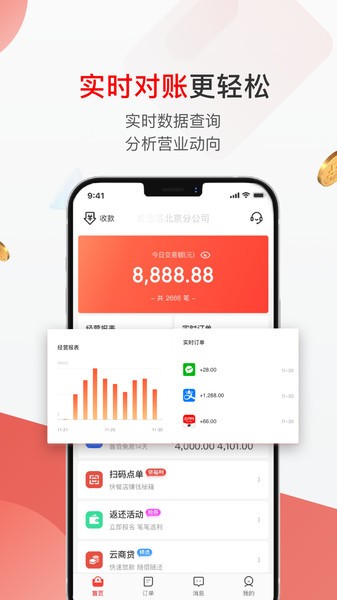 3、快速查账,商户可通过系统实时查看日常账单及账目报表。