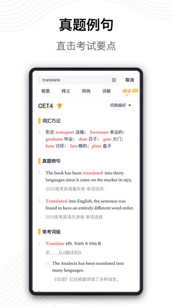 5、个性化定制:根据学习目标,可设置“职场商务、托福雅思、考研、四六级、初高中”等词典偏好,获取特专属词汇书和精讲。