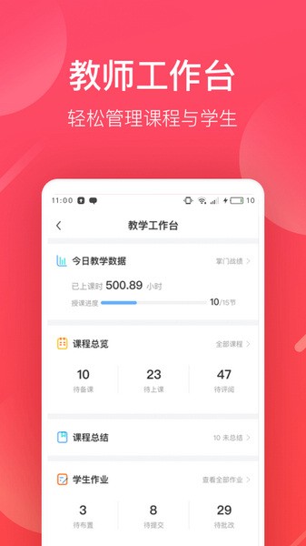 4、教学工作台:专为掌门讲师打造了课程管理、智能排课、学生管理等教学工具,方便掌门讲师随时开课、备课,及时处理教学工作。更有专项技能培训,辅助老师能力提升
