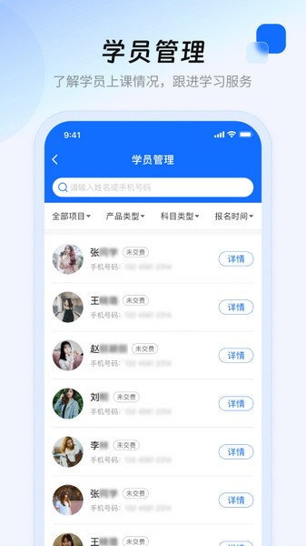 --学员管理:学员管理可查看学员的报名信息、订单详情、上课班次、上课记录详细内容;