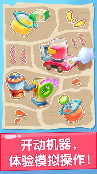 在加热容器里融化糖块、糖果,用混合器将果汁汽水融合、在灌装机上将果汁装好……神奇好玩的机器世界,等你大显身手!