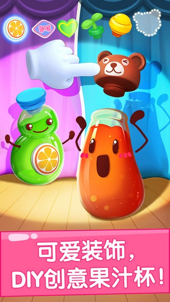 游戏里有好多创意玩法,比如DIY搭配不同水果,设计独特的口味和颜色;还可以用各种瓶塞和贴纸装饰瓶子,甚至加冰块和糖果,感觉特别有成就感!而且没有时间限制,小朋友可以慢慢体验整个制作过程,完全不会觉得枯燥。