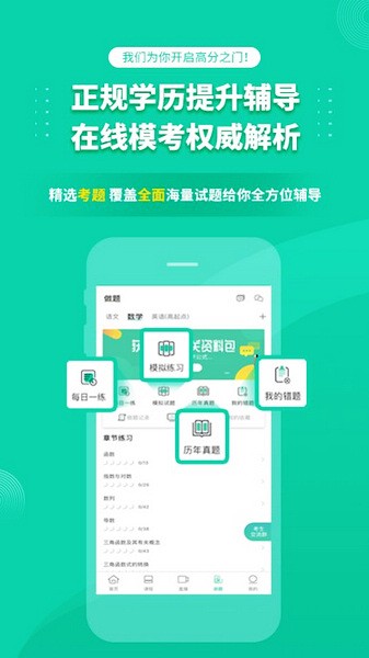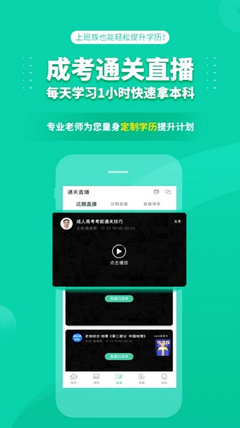 成人高考成考app形成最科学的方式,教、学,练,问,一套最完整解决方案。必考知识点,考试须知,历年真题讲解,想过成人高考———坚持每天上直播。