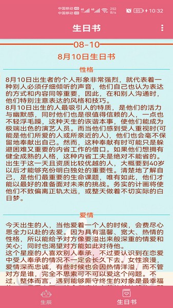 生辰助手是一款能查生辰八字的手机软件,感觉挺有意思的。只要输入出生时间就能算出你的八字信息,还能结合星座、生肖来解读运势,内容很丰富,涵盖了性格分析、爱情、事业啥的,甚至还有生日书这种功能,可以看看和你同一天出生的人有什么特别的地方。