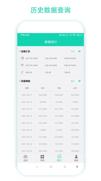 2、针对各种应用的流量使用,这款软件可以给用户详细的记录下来,用户可随时的进行查阅,十分的周到。