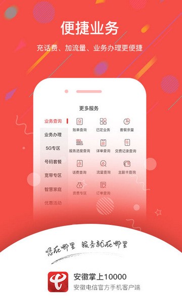 安徽掌上10000是安徽电信官方专为用户打造的集话费查询、账单详情、流量查询办理等自助服务于一体的便民生活手机客户端。百万安徽电信用户的良心推荐,官方唯一手机营业厅