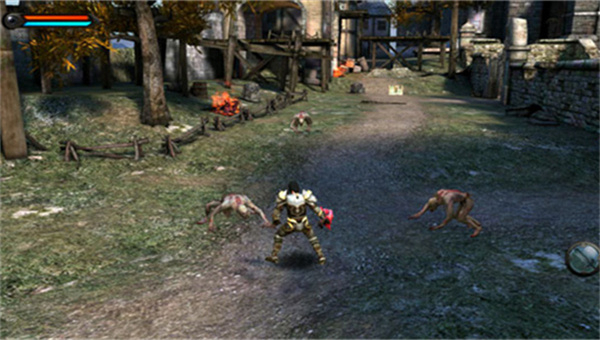 国王村:在普通难度下,属于纯粹新手关,木桶,罐子都是可以砍的,里面有金币,先练练手。敌人来了!会暂时出现一个结界,把你困在这个战场上,直到消灭所有敌人才能离开。开头的小怪就是来送死的,体验一下砍杀和操控吧。游戏支持自动瞄准怪砍杀的辅助系统,总的来说还是比较好用,但有时你想优先杀某怪或面对弓手和法师要尽量快速近身灭之,可能需要调整一下,不要连按,而是朝想杀的怪先冲过去砍