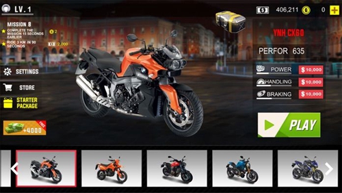 2、十款来自世界各地最帅气经典的摩托车随你挑选,动力、操控等多项改装,让你不断突破自己的最高速度;
