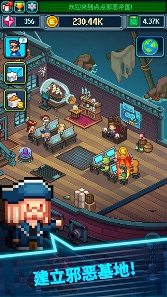 游戏中有很多有趣的特色,比如独特的剧情设定,从打工仔到建造邪恶帝国的逆袭故事;多元化的手下招募系统,每个角色都有专属技能;还有基地建设、黑市交易等丰富的经营玩法。尤其是幽默搞怪的视觉风格和Q版角色设计,让整个游戏体验轻松愉快。