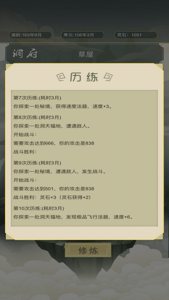 历练:可以获得属性、异兽、灵石。