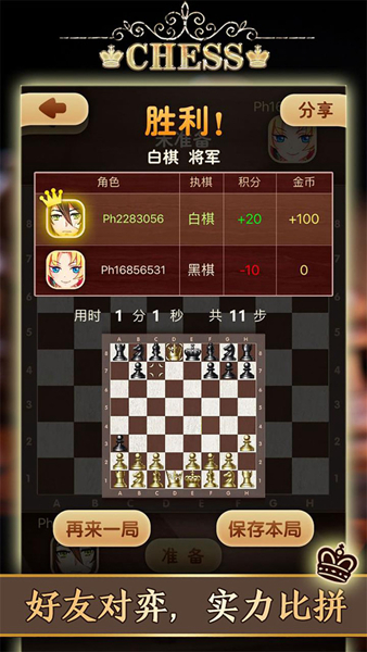 天梨国际象棋游戏是一款非常出色的棋类竞技手游,玩家可以在这里随时随地和其他玩家一较高下,并且对局玩出之后还可以将下棋的过程进行保存,方便之后进行回顾和分享。如果是玩家对战的话是有积分机制的,通过积累积分,我们也会遇到越来越厉害的对手,保证每一次的竞技都能让你过瘾。此外游戏也为玩家们准备了AI陪练玩法以及好友约战功能,可以更好地练习技术。游戏特色