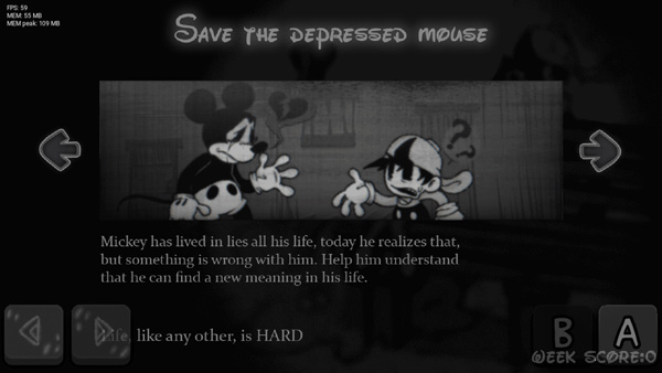 米奇笑的比较诡异,上下动过一个循环后闪一下脸。变身后,与之前的happy阶段那个米老鼠模样差不多。唱的过程中会闪出一张米奇融化的脸,bf可能会变成全身黑。脸部变成满脸番茄酱的米老鼠不断抖动。