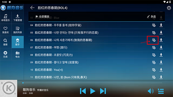 答:点击“多选”选择您想要的歌曲,点击下载就会下载多首歌曲到本地音乐。
