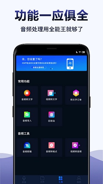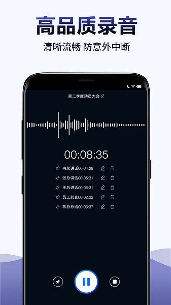 录音全能王是一款非常好用的录音工具,软件体积小巧,但是其中的功能却非常齐全,通过该软件用户们可以非常轻松的记录下各种音频,并且还能对录制的语音进行剪辑,将语音转换为文字等,对于经常需要记录开会内容的用户们来说是个非常方便的功能。此外,录音全能王采用了云端加密存储技术,防止大家储存的语音丢失和误删,为您留住重要文件。