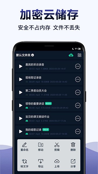 亮点三:录音云端同步—采用云端加密存储技术,防丢失,防误删,[为您留住重要文件,解放您的手机内存~]