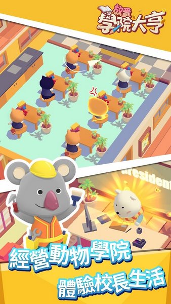 放置学院大亨是一款超好玩的休闲模拟经营手游,玩家可以当校长,建设校园,管理学生和教职工。游戏画面萌到不行,3D卡通风格配上各种可爱的动物角色,二哈、企鹅、白熊、鳄鱼都来当老师和学生啦!作为校长,我得负责完善教室设备、升级食堂、保持环境整洁,还要扩建学校吸引更多的学生来上学。