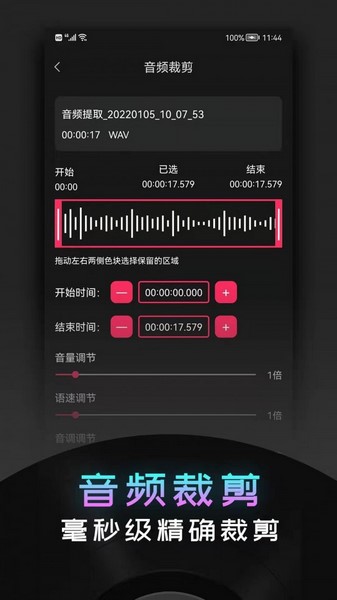 2. 音频裁剪:毫秒级精 确裁剪音频、音量放大、语速、音调调节。