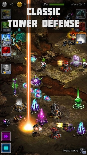 新手入门需要先建矿场获取金币,再用金币建防御塔。游戏中有减速等特殊效果的塔,放置位置很重要。消灭所有敌人就能获胜并获得评分。相比其他塔防游戏,远古行星中文版最大的特点是允许玩家在关卡中选择增益Buff,并且基地和防御塔都可以灵活升级。
