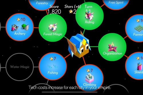 用一个战士发现隐藏在雾中的小村庄,征服他们,他们将成为你王国的新城。但要注意,加入帝国的城市越多,技术研究的成本就越高。