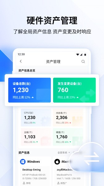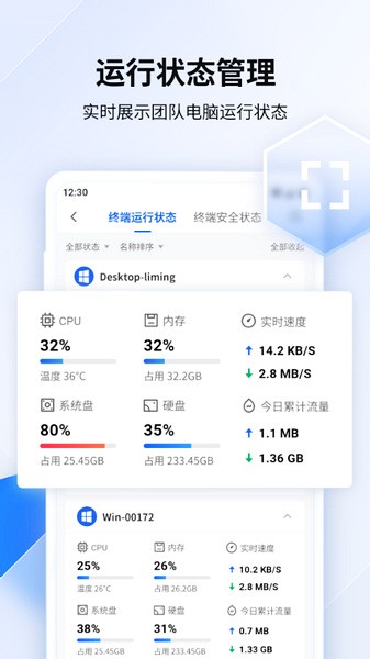实时展示团队所有电脑的CPU、内存、累计使用流量等运行状态,第一时间发现异常电脑,减少不必要的损耗;