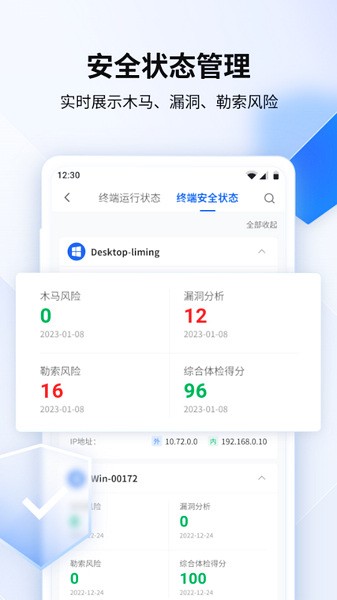 实时展示团队所有电脑的木马、漏洞、勒索风险,安全问题看得见、防得住,安全管理高效又省力。